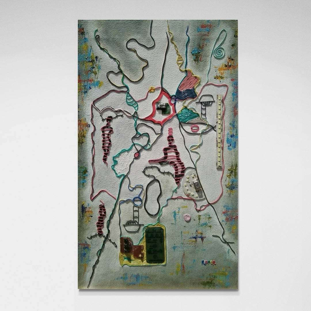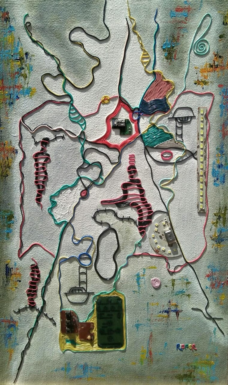 Electric wire, motherboard, and acrylic on canvas