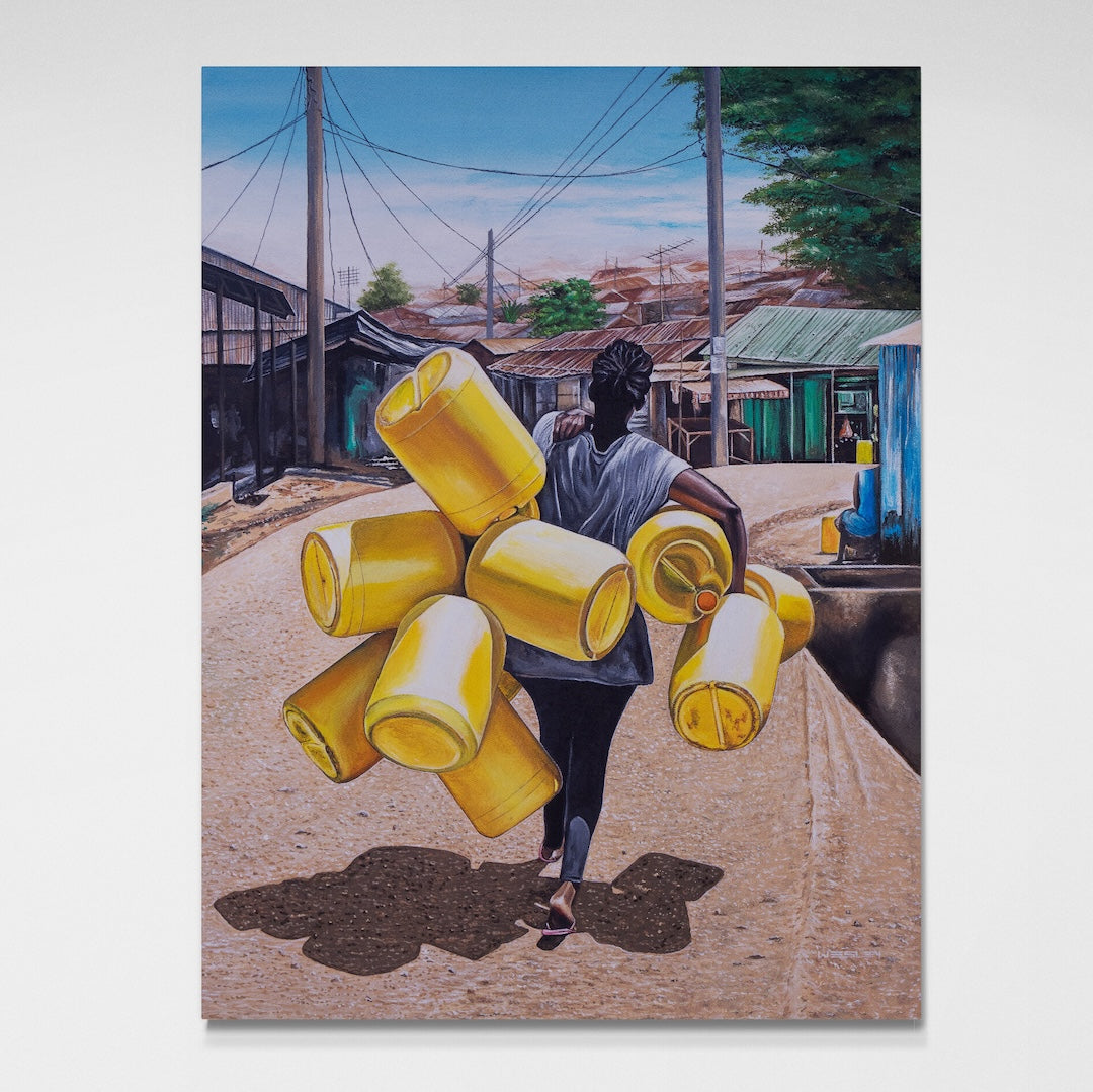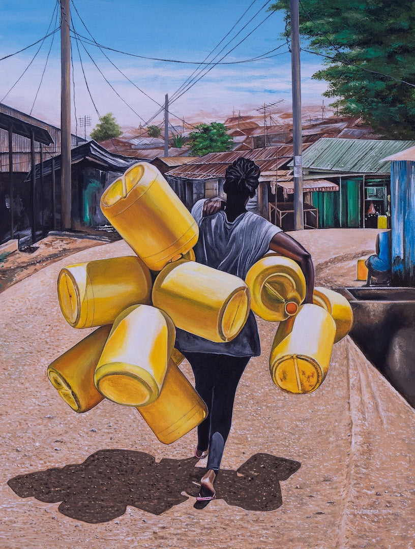 This piece was created at the Uweza Art Gallery by a youth artist living in the Kibera slum of Nairobi Kenya. 60% of the proceeds of this sale will go to the artist and 40% will go toward the operations of our art gallery, which provides opportunities for creative expression and development of artistic talent for children and youth living in Kibera.