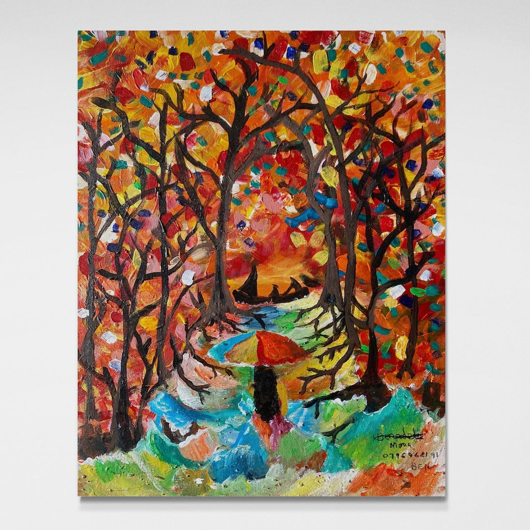 This piece was created at the Uweza Art Gallery by a youth artist living in the Kibera slum of Nairobi Kenya. 60% of the proceeds of this sale will go to the artist and 40% will go toward the operations of our art gallery, which provides opportunities for creative expression and development of artistic talent for children and youth living in Kibera.